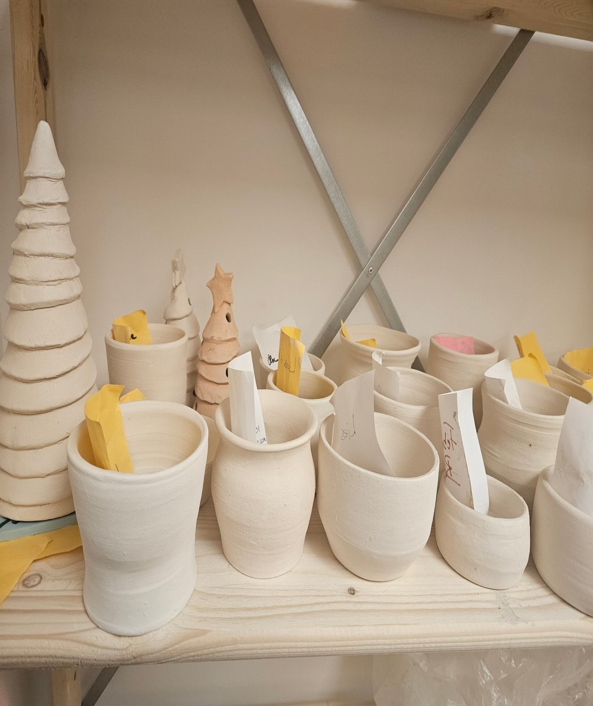 Tijdens onze openingsdagen mochten we ongelooflijk veel enthousiaste mensen verwelkomen. Jullie kwamen langs om te experimenteren met klei, om kerstboompjes te maken, of om potten te draaien. Onze droogrekken vulden zich in een mum van tijd met de prachtigste creaties, terwijl onze klei-emmer soms overliep van restjes. Het was een heerlijk georganiseerde chaos waarin vloeren en ramen bespetterd werden en handen onder de klei zaten.
